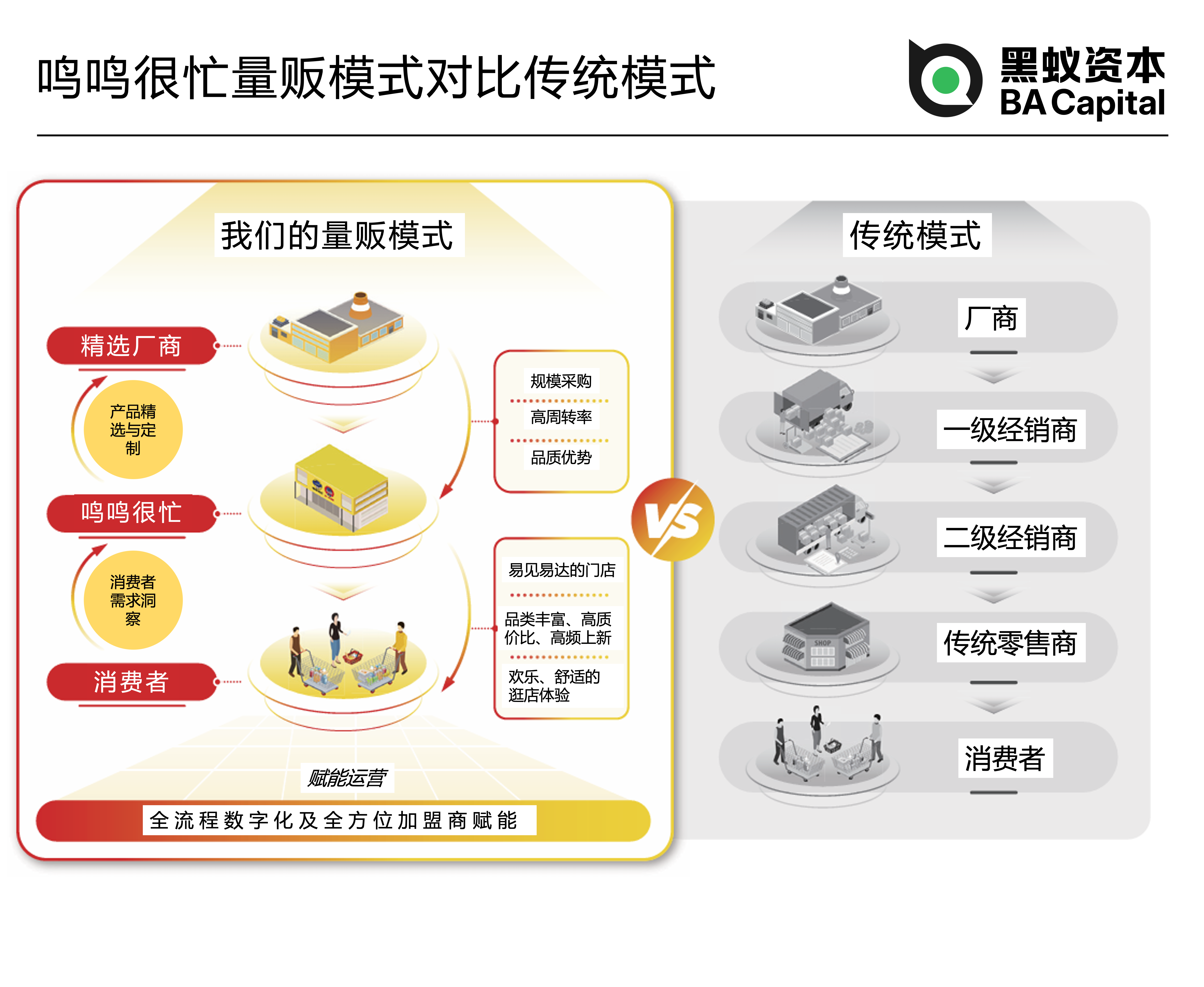 创新的商业模式、极致的效率追求、利他的创业精神、丰富的上游资源、上升的县镇人口等,这些要素共同推动了鸣鸣很忙的发展,成长为县域市场商业基础设施。