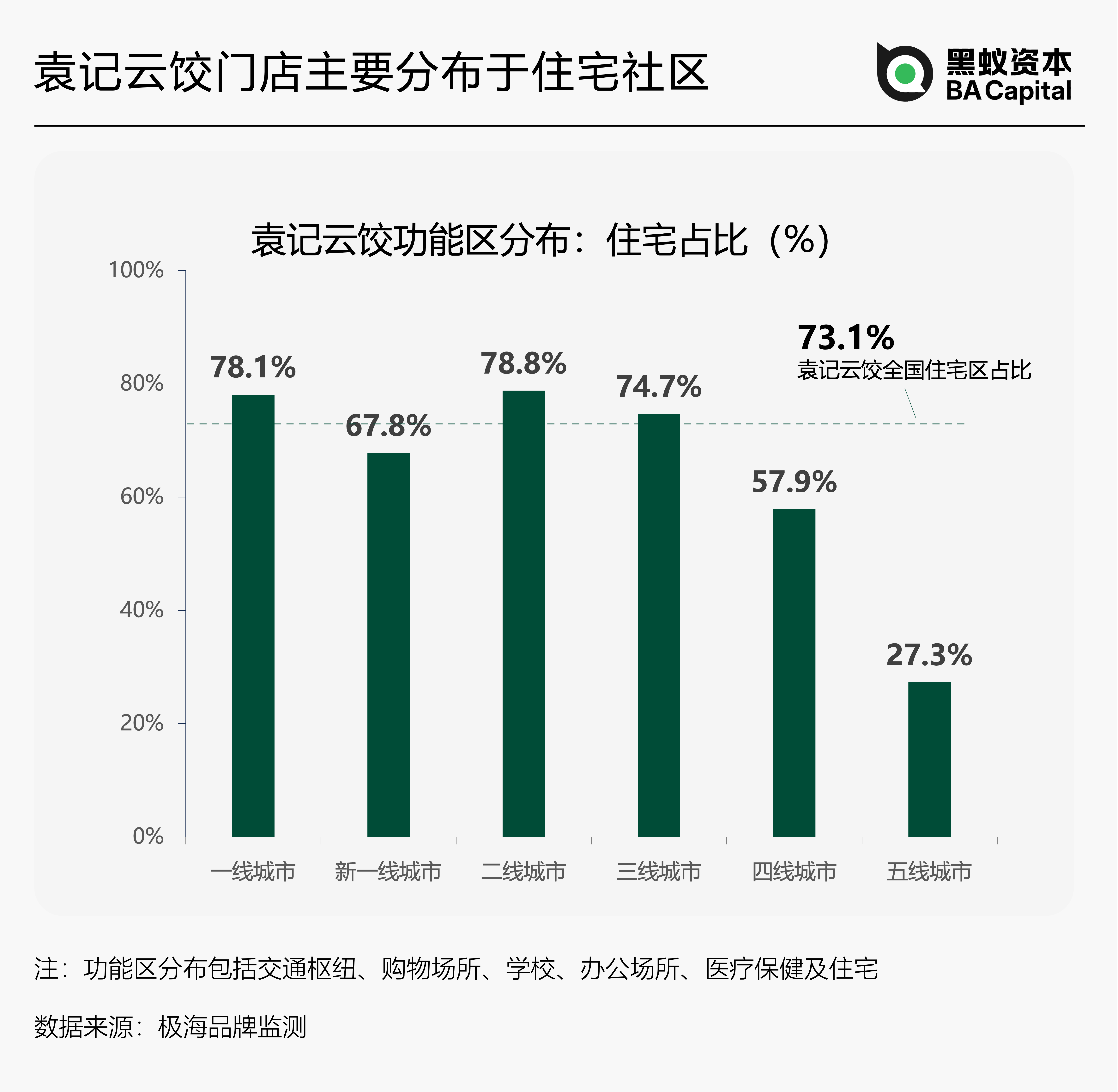 此外,袁记食品门店分布的另一特征是高度社区化。袁记食品超过70%的门店坐落于各类社区场景,其中一线城市相对更高,这不仅定义了袁记食品「家门口的便民食堂」的品牌认知,更是支撑其门店数量远超行业其他玩家总和(袁记食品国内的门店数超过第二名至第十名的总和)的关键战略选择。