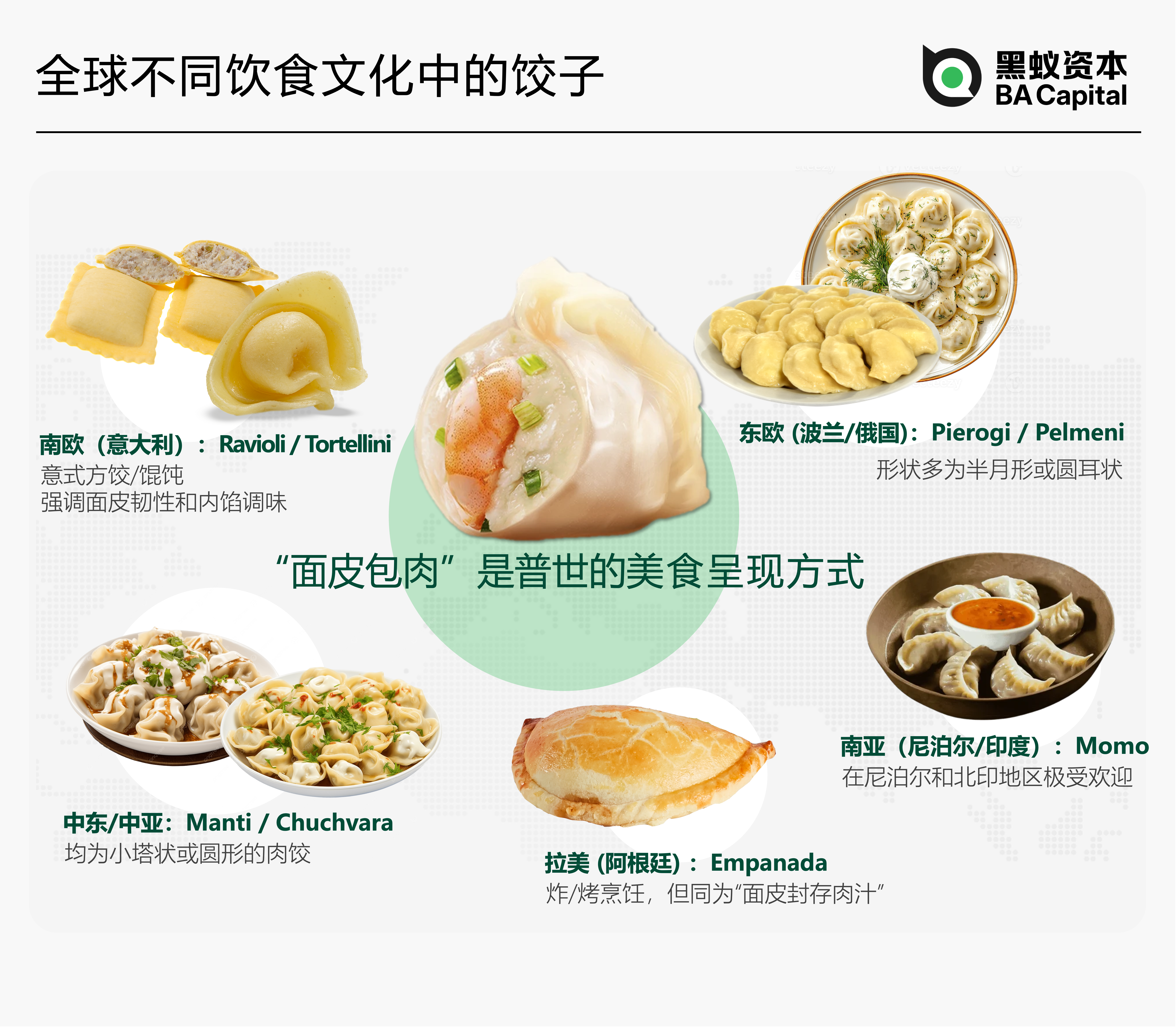 广泛的认知基础与形式变体。在狭义的中餐范畴内,饺子是高频、刚需的国民单品。若将其理解为「面皮包裹馅料」这一更普世的饮食表达,则其在全球拥有大量同类产品——从意大利方饺(Ravioli)、波兰饺子(Pierogi)到拉丁美洲馅饺(Empanada)。这种全球性的品类心智显著降低了海外市场的教育成本。