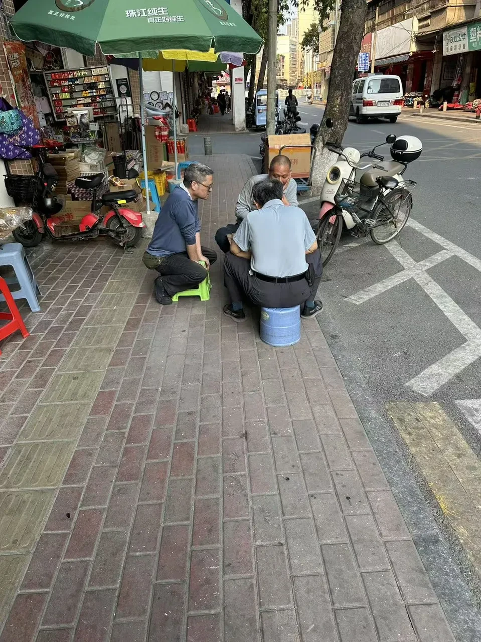 店主本人看店,闲暇时在旁边看下棋并自得其乐,摄于广东清远佛冈