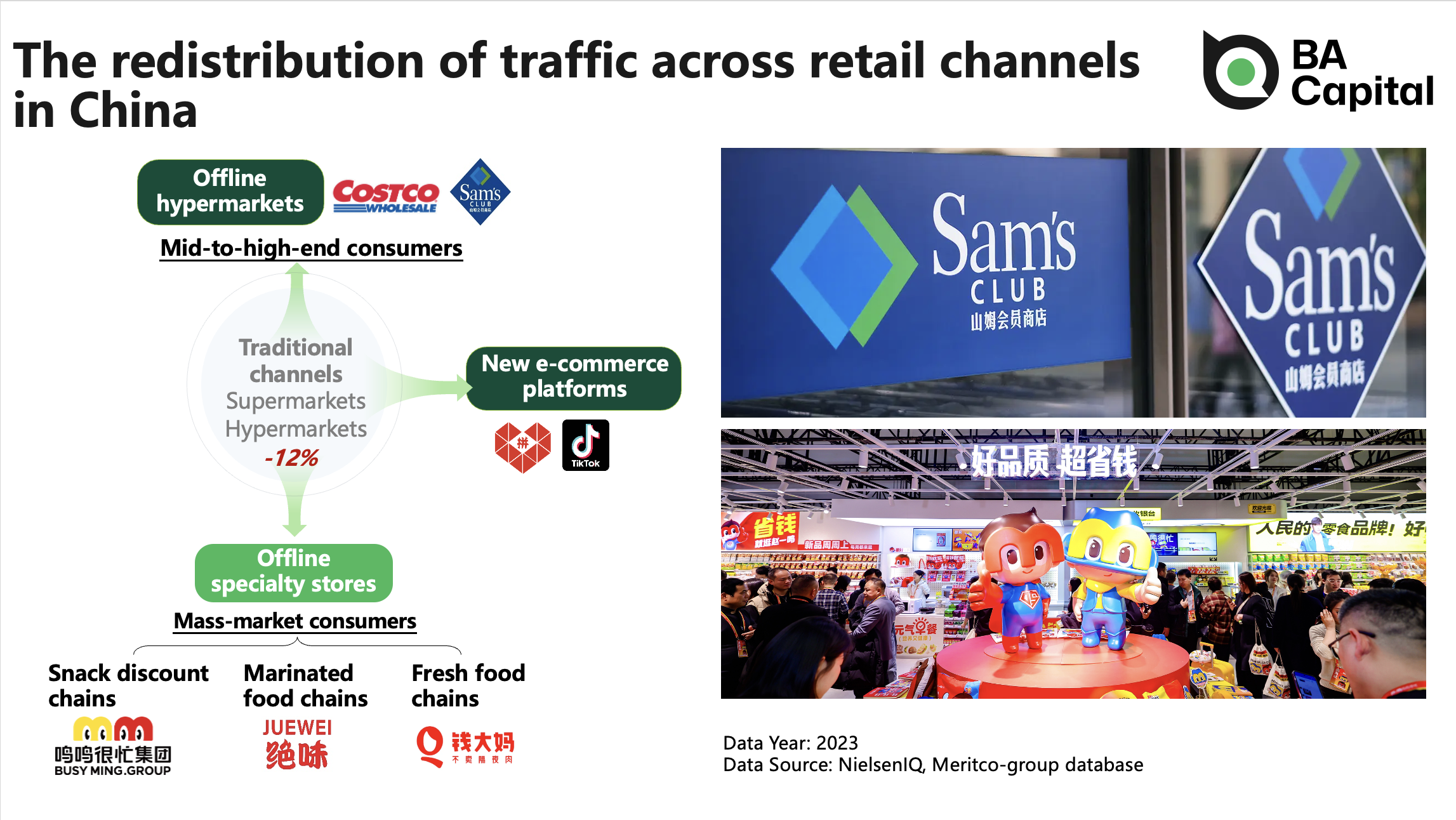 Traditional hypermarkets have seen their traffic redistributed: mid-to-high-end consumers have migrated to membership-based warehouse clubs such as Sam’s Club and Costco; product categories that are better suited to the efficiency of e-commerce have shifted toward platforms like Pinduoduo and Douyin; mass-market consumers have gravitated toward category-specific offline specialty chains offering optimal efficiency for each segment, such as snack discount chains, marinated food chains, and fresh food chains.